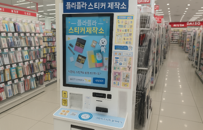 '다이소 폴라폴라 스티커 제작소'는 다이소 매장 내에 설치된 키오스크 형태의 즉석 사진 인화기예요. 스마트폰에 저장된 사진을 카카오톡이나 QR코드로 간편하게 전송해서 폴라로이드 느낌의 스티커 사진으로 바로 받아볼 수 있답니다. 무엇보다 단돈 2,000원이라는 놀라운 가격에 다양한 프레임의 사진 스티커를 만들 수 있다는 점이 가장 큰 매력인데요.