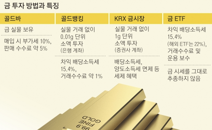 | 투자 방식 | 실물 금괴 직접 구매 | 주식처럼 1g 단위로 거래 | 주식처럼 1주 단위로 거래 | 은행 계좌에 0.01g 단위 적립 |