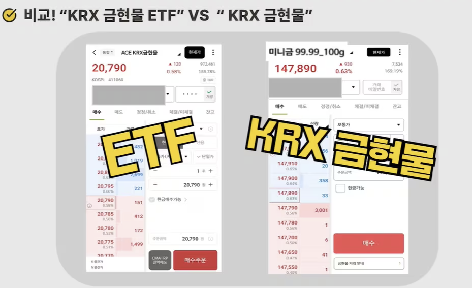| 비교 항목 | KRX 금시장 (절세형 장기 투자자) | 금 ETF (전략형 단기 투자자) |