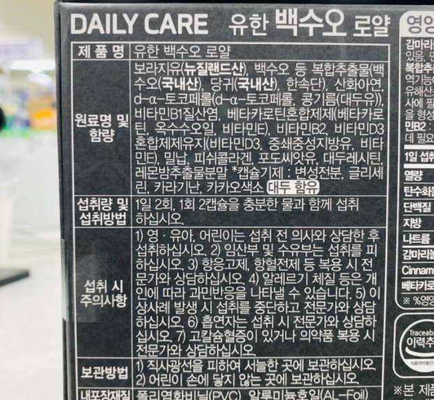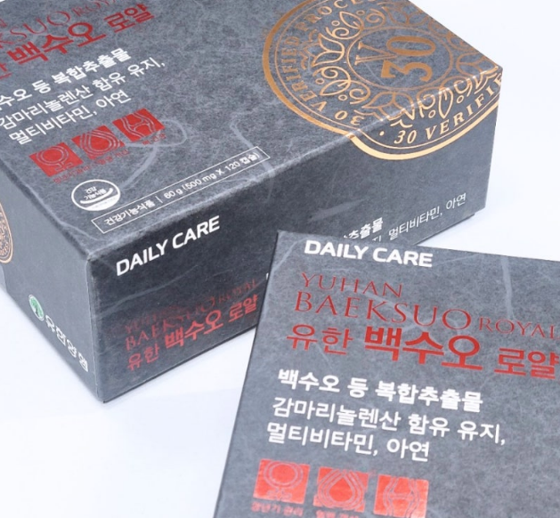 부가 성분: 유한 백수오 엠플: 캘리포니아 햇빛을 받은 버섯 분말에서 추출한 비타민 D, 프랑스산 은행잎 추출물 등 추가