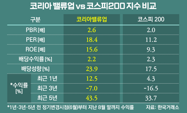 밸류업 지수의 PER(18.4배)가 코스피200(11.2배)보다 높아, 편입 기업들의 성장 기대감이 더 크다는 것을 시사합니다.