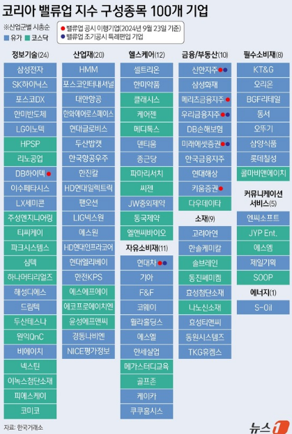 코리아 밸류업 지수는 국내 기업의 저평가 현상(코리아 디스카운트) 해소를 위한 기업 밸류업 지원방안의 일환으로 만들어졌습니다. 이 지수는 100개의 종목으로 구성되어 있으며, 유동 시가총액 가중방식으로 산출됩니다.