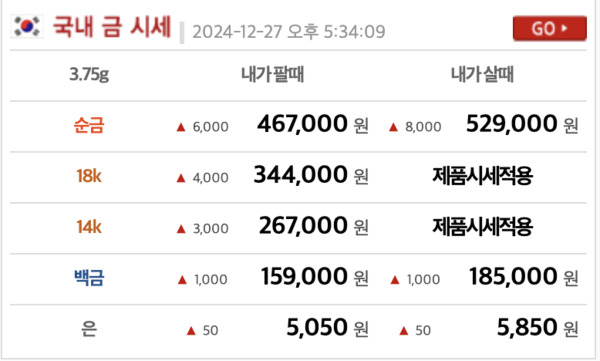 순금(24K) 시세: 순도 99.9% 이상의 금으로, 가장 높은 가치를 지닙니다.