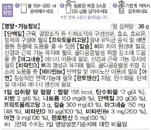 섭취 방법도 간단합니다. 물 또는 우유 150~200ml에 하이뮨 분말 3스푼(38g)을 넣고 가볍게 섞어 마시면 됩니다. 아침 식사 대용이나 운동 후 간식으로 좋으며, 기호에 따라 물 대신 우유나 두유를 넣어 더욱 맛있게 즐길 수도 있습니다.