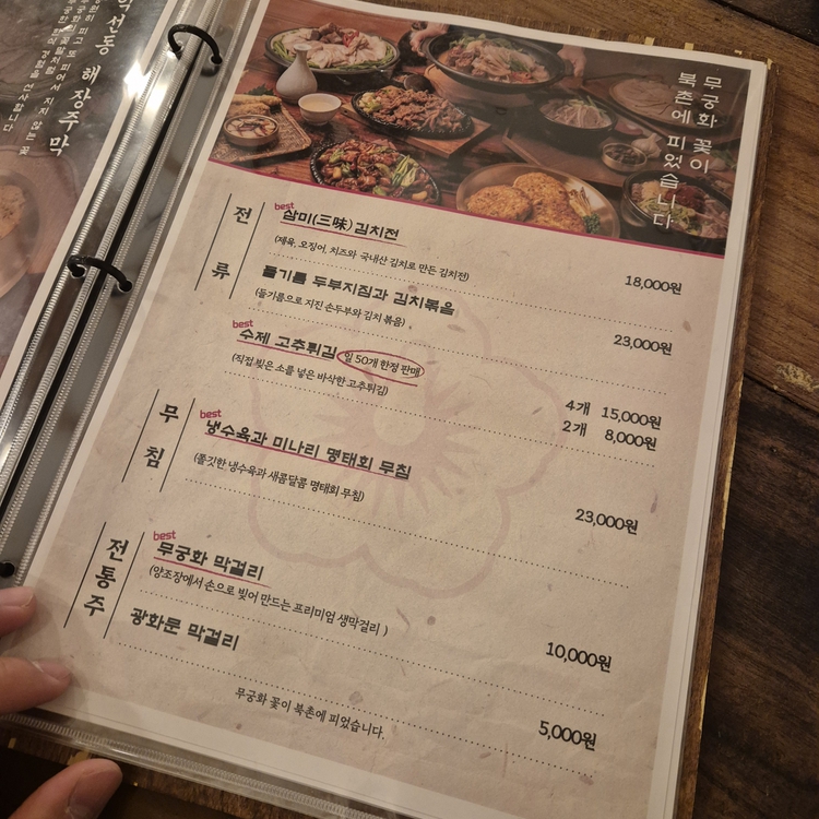 이곳은 술안주로도 적합한 다양한 메뉴를 제공하며, 특히 '북촌 무궁화 막걸리'라는 특별한 막걸리로 유명합니다. 이 막걸리는 동대문구 장안 양조장의 장안누룩 09로, 첨가물 없이 쌀, 물, 누룩으로만 빚어져 자연스러운 맛을 자랑합니다. 막걸리는 9도짜리로, 얼음 없이 마셔도 진하고 달큰한 맛이 특징입니다.