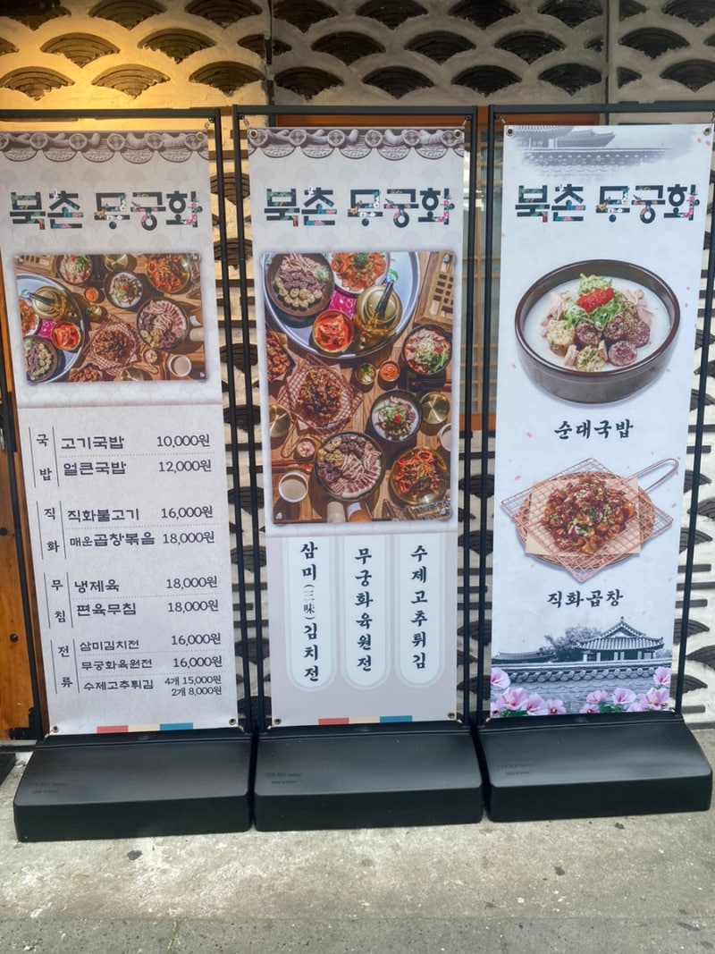 북촌무궁화는 다양한 한식 메뉴를 제공합니다. 대표메뉴로는 순대국밥, 직화곱창, 직화불고기, 냉수육, 불고기, 미나리 홍어무침, 고추튀김, 술국, 수육, 고추장 곱창찌개 등이 있습니다. 특히, 직화곱창과 직화불고기는 많은 방문객들에게 인기가 있으며, 매운 곱창볶음은 매운 음식 좋아하는 사람들에게 특히 추천됩니다.