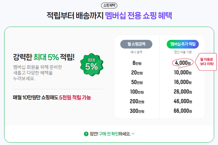 - 쇼핑의 만족도를 높이는 부가 혜택: 매월 배송비 3,500원 할인 쿠폰 2장, 도착보장 상품 1개 무료 반품 등 소소하지만 확실한 혜택으로 쇼핑 만족도를 높여줍니다.