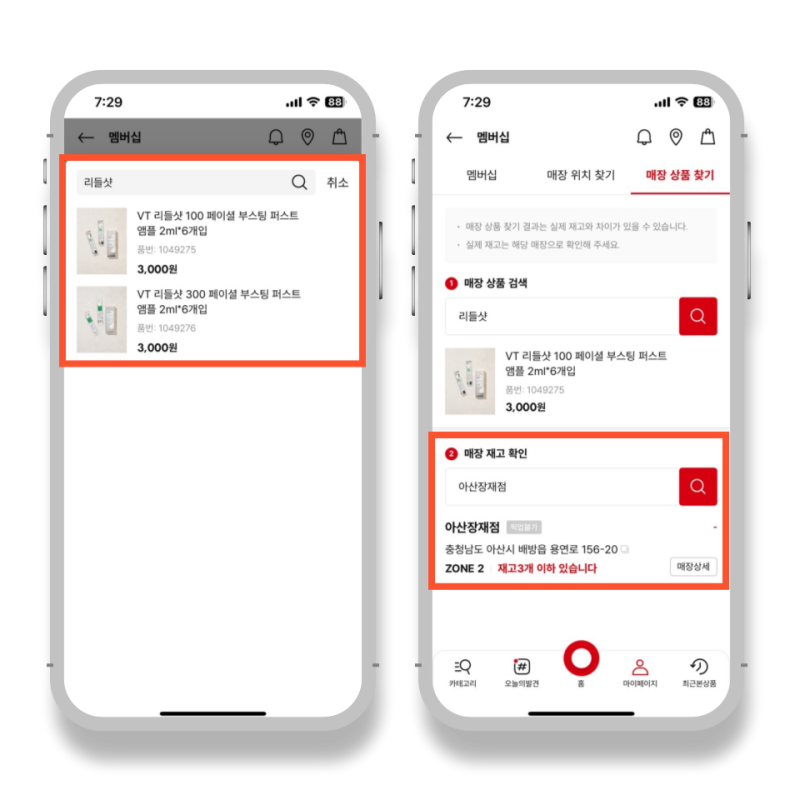 - '매장상품 찾기' 탭에서 원하는 상품명을 검색합니다.