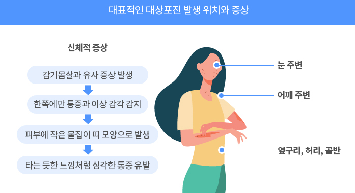 대상포진은 신경에 잠복하고 있던 수두 바이러스가 신경을 따라 피부에 나타나는 것으로, 아프거나 따끔거리는 느낌의 통증이 발생합니다. 신경을 따라 수포가 발생하는데, 수포는 2~3주 정도 지속되며 시간이 지나면서 딱지로 변하게 됩니다.