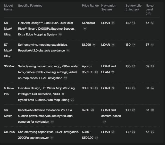 1.S6 MaxV: 가장 고급 모델 중 하나로, 인공지능 기술과 카메라 기술을 비롯한 다양한 혁신적인 기능을 갖추고 있습니다. 자동 먼지 비움 기능과 물걸레 청소 기능도 지원합니다. 가격이 다소 비싸지만, 높은 성능과 편의성을 원하는 사용자에게 적합합니다.