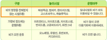 * 혹시 모르니 비가 그리 많이 오지 않는다면, 아트란티스, 자이로드롭, 자이로스윙, 번지드롭, 고공파도타기, 회전그네 등도 앱으로 꼭 확인하셔야 합니다.