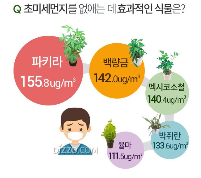 1. 파키라 : 미세먼지 제거 효과가 가장 뛰어남. 4시간 동안 155.8µg/m³의 초미세먼지 제거