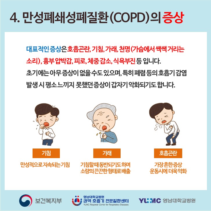 - 비약물적 치료: 호흡 재활 운동, 독감 및 폐렴 예방접종, 적절한 영양 섭취