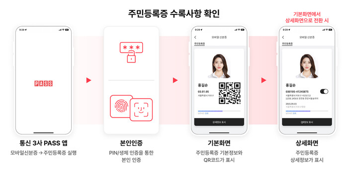 주민등록증 수록사항을 스마트폰에 저장하여 소지할 수 있으며, 본인인증 절차를 통해 QR코드 형태로 표출하여 진위여부를 확인할 수 있습니다. 이러한 방식으로 실생활에서 주민등록증이 필요한 상황에서 편리하게 이용할 수 있습니다. 2021년 모바일 공무원증을 시작으로, 2022년 운전면허증, 2023년 국가보훈등록증 등으로 확대되어온 모바일 신분증의 일환입니다.