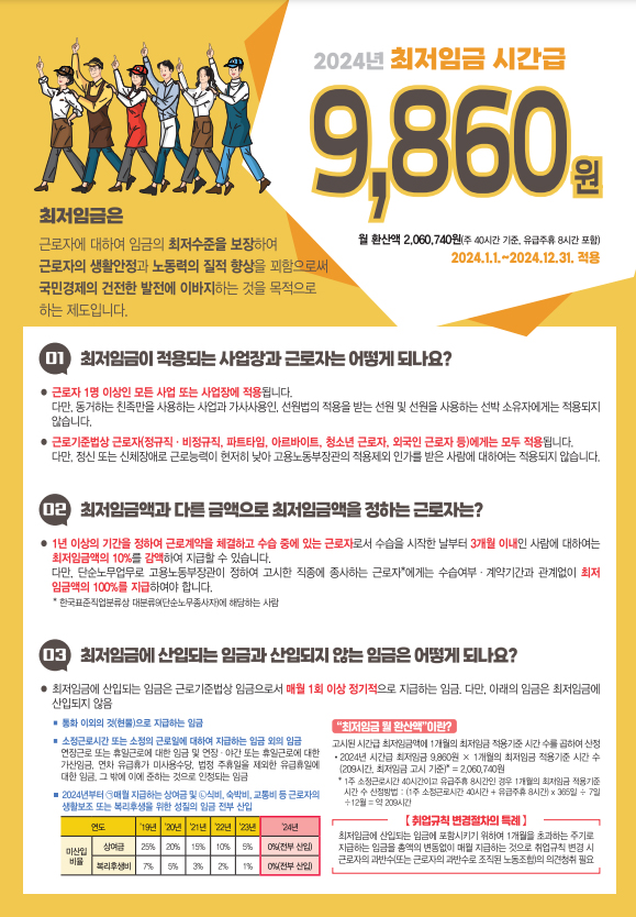 최저임금 산입범위 확대: 2024년부터 정기 상여금 및 복리후생비 전액이 최저임금 산정에 포함됩니다.