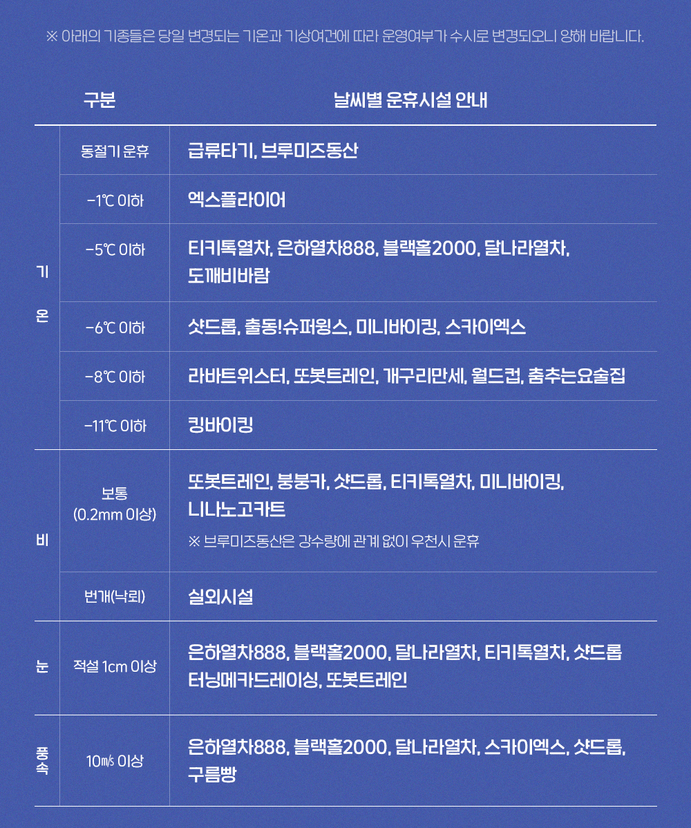* 급류타기 : 우비를 입고 탑승하는 후룸라이드로, 비 오는 날에만 즐길 수 있는 특별한 재미를 선사합니다.