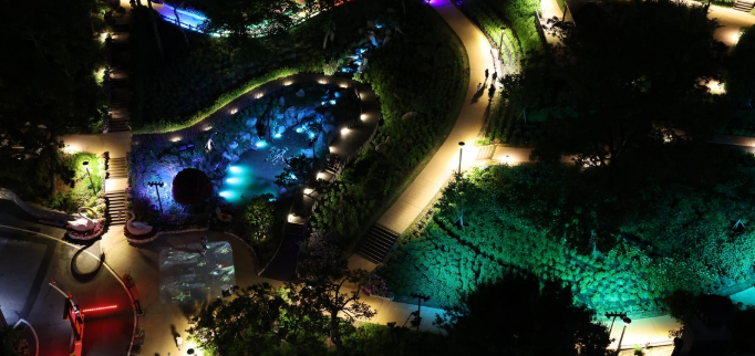 - 생태연못과 물레방아: 중앙 계단을 지나 조금 더 안쪽으로 들어가면 시원한 물소리가 들려오는 생태연못이 나타납니다. 졸졸 흐르는 작은 폭포와 정겹게 돌아가는 물레방아는 청량감을 더해주죠. 이곳에서는 물에 비친 수국과 하늘을 함께 담아보세요. 특히 밤이 되면 수중 조명이 켜져 연못 전체가 신비롭게 빛나는데, 이 또한 놓칠 수 없는 야경 포토존입니다.