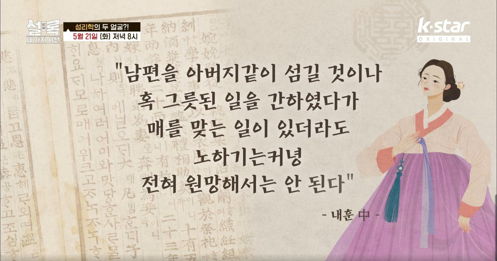아무래도 조선시대 여성의 모습이라는 게 현재의 관점에서는 정말 이해안되는 점들이 많았기 때문에 더 그러실 수 있습니다. 특히나 방송을 보면서, 여성의 계급이라는 게 조선이 성리학으로 기틀을 마련하는 시점에는 더더욱 억압받을 수 밖에 없었다는 사실을 확인할 수 있었습니다.
