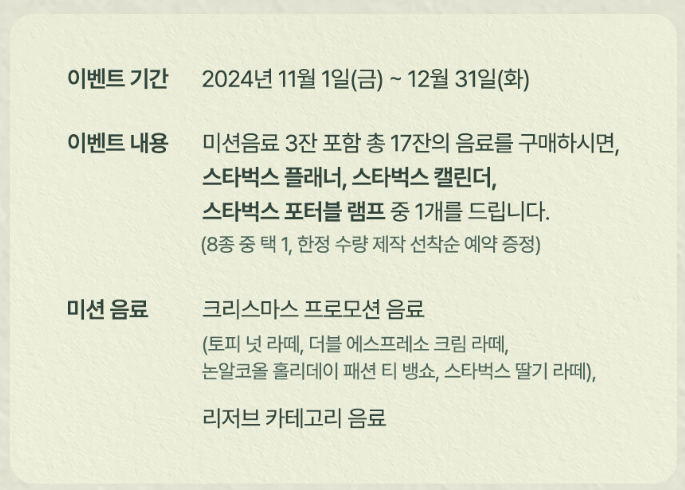 스타벅스의 겨울 e-프리퀀시 이벤트는 매년 많은 고객들의 기대를 받고 있습니다. 올해는 특히 포터블 램프라는 매력적인 상품으로 더욱 뜨거운 관심을 받고 있죠. 이 이벤트는 스타벅스 앱을 통해 참여할 수 있으며, 음료를 구매할 때마다 e-스티커를 적립하는 방식으로 진행됩니다.