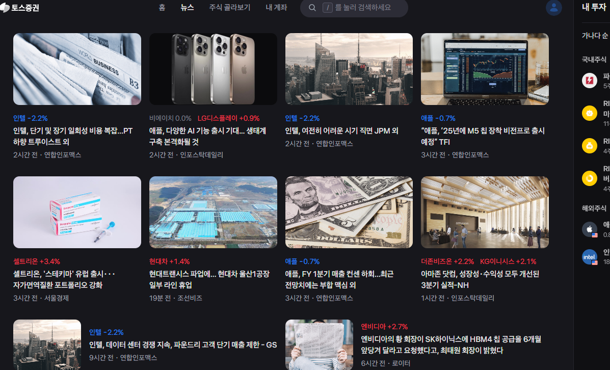이런 사항들은 토스 증권을 사용하는 사람이 아니더라도 주식 투자를 생각하시는 분들은 일반적으로 알고 계셔야 하는 전략입니다. 다만 토스증권에서는 분산투자, 리밸런싱, 경제 지표 분석과 같은 투자 지표를 쉽게 확인할 수 있어 좋았습니다. 특히나 모바일 버전 이외에 새롭게 출시된 PC 버전에서 쉽게 확인할 수 있습니다. 관심있거나 보유중인 종목들에 대한 뉴스도 쉽게 확인할 수 있어서 좋습니다.
