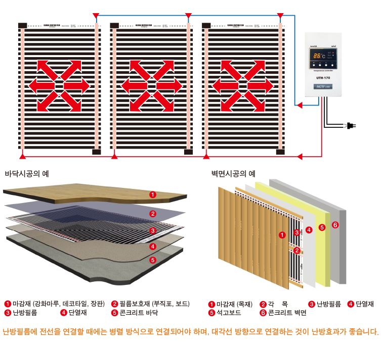 - 전기 연결: 필름에 전선을 연결하고, 온도 조절기를 통해 전원을 공급합니다.