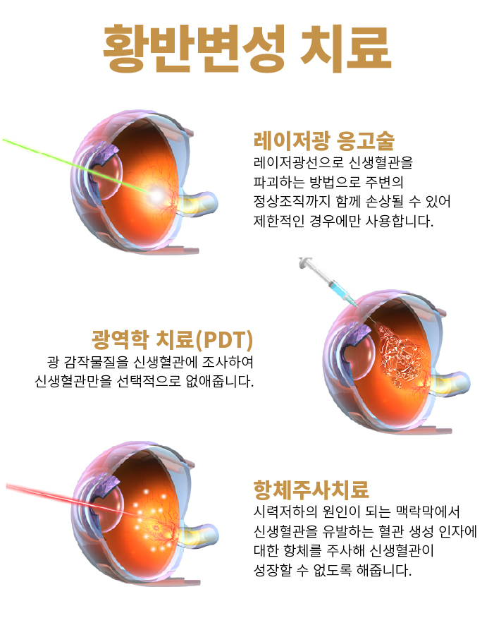 - 레이저 광응고술: 황반 주변부 신생혈관 치료에 사용