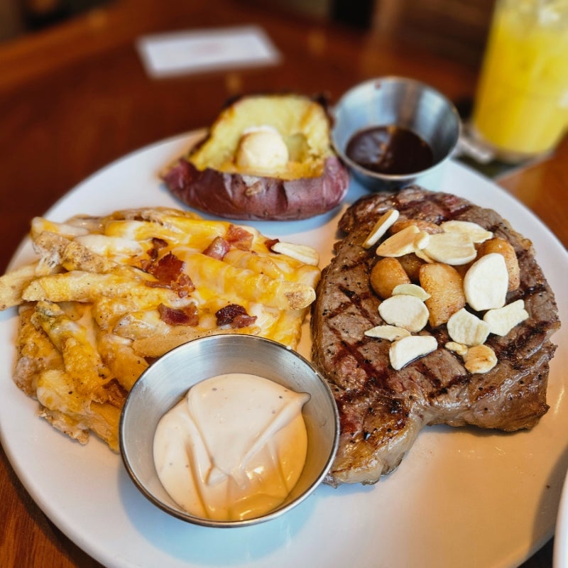 갈릭 립아이는 마늘을 활용한 특제 시즈닝으로 풍부한 향과 맛을 자랑합니다. 꽃등심 특유의 부드러운 육질과 마블링이 입안에서 녹는 듯한 식감을 선사합니다. 스테이크 위에 올려진 구운 마늘은 풍미를 한층 더해줍니다.