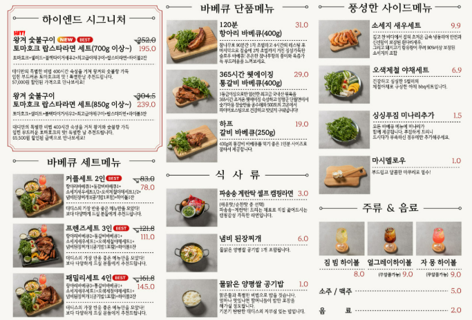 패밀리세트 (4인) | 145,000원 | 항아리 바베큐(3) + 통갈비 바베큐 + 소시지/새우 + 야채 + 된장찌개 + 공기밥 + 하이볼(택2) |