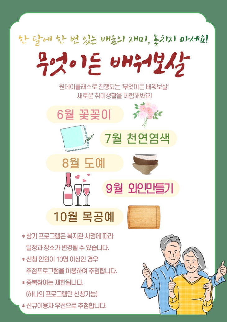 - 어르신들의 취미생활과 관련된 학습 프로그램 제공 (주로 강의 형태)