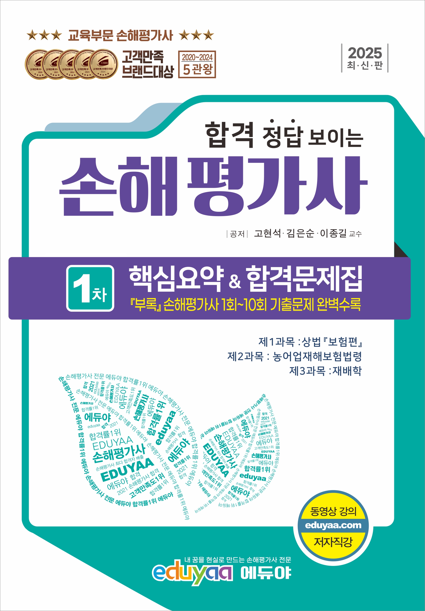 - 손해평가사 1차/2차 교재: 에듀야는 손해평가사 시험에 최적화된 기본서, 문제집, 핵심 요약집 등 다양한 교재를 제공합니다. 특히, 2025년 시험 대비 최신 개정 내용을 반영한 교재를 통해 수험생들은 효율적인 학습을 진행할 수 있습니다.