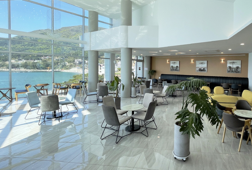 통유리창을 통해 실내에서도 바다를 감상할 수 있습니다.