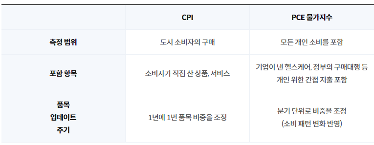 | 구분 | CPI (소비자물가지수) | PCE (개인소비지출 물가지수) |