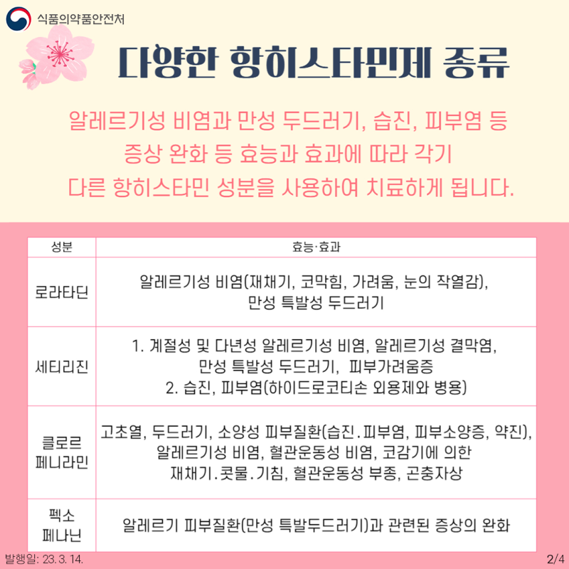 대표적인 약물: 로타타딘 10mg 1정, 클로르페니라민 말레인산염 등