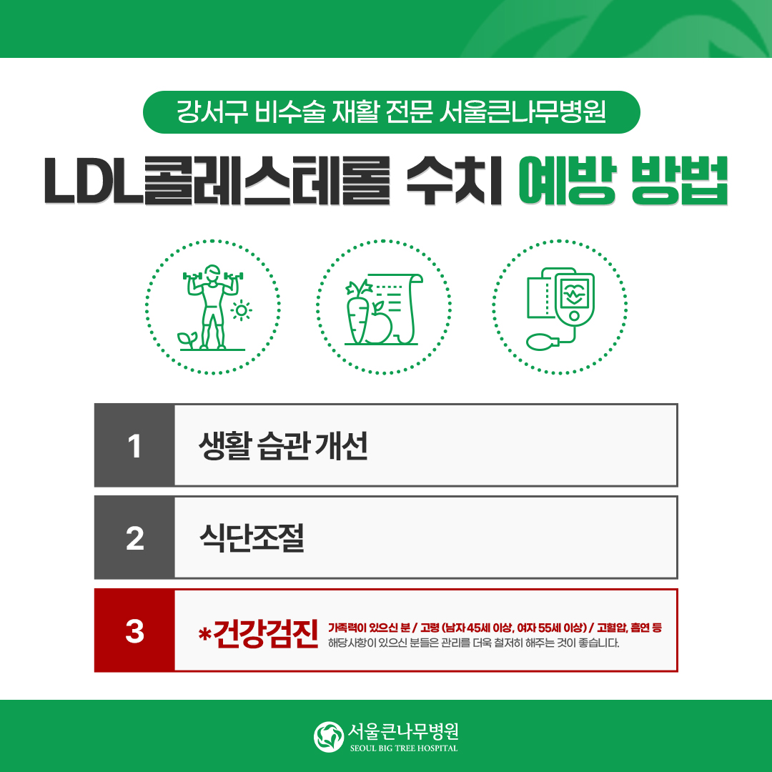 이러한 방법들을 꾸준히 실천하면 LDL 콜레스테롤 수치를 효과적으로 낮출 수 있습니다. 하지만 개인의 건강 상태에 따라 적절한 방법이 다를 수 있으므로, 정확한 진단과 관리를 위해서는 의사와 상담하는 것이 좋습니다.