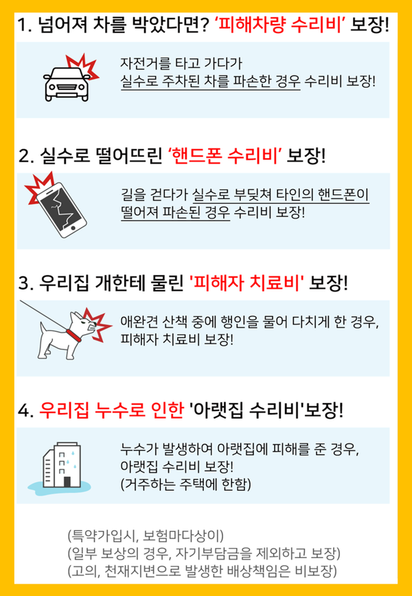 - 다양한 일상 상황 보장: 주택 관련 사고부터 개인 및 가족 관련 사고까지 폭넓은 보상 범위