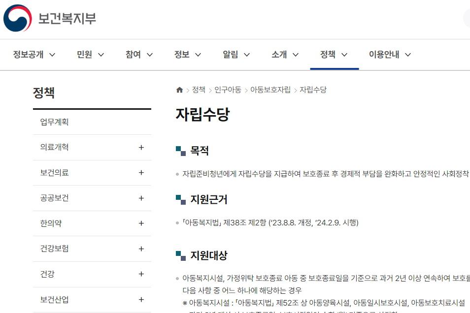 - 확대된 지원 대상 (중요!): 2024년 2월 9일부터는 법이 개정되어, 만 15세 이후에 보호가 조기 종료된 경우에도 만 18세가 된 날로부터 5년까지 지원을 받을 수 있게 되었습니다. 혹시 해당된다면 꼭 확인해보세요!