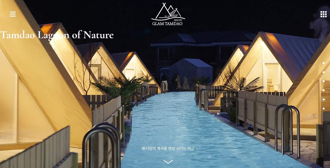 글램 탐다오의 가장 큰 특징 중 하나는 70미터 길이의 전객실 풀엑세스 온수풀 '라군’입니다. 이 풀장은 국내 글램핑장 중 최장 길이를 자랑하며, 모든 객실에서 직접 접근이 가능합니다. 미온수로 온도를 유지하는 시스템과 정화순환시스템을 갖추고 있어 계절과 시간에 관계없이 항상 쾌적하고 깨끗한 환경에서 수영을 즐길 수 있습니다. 특히 밤에는 은은한 조명과 함께 로맨틱한 분위기를 연출하여 특별한 경험을 제공합니다.