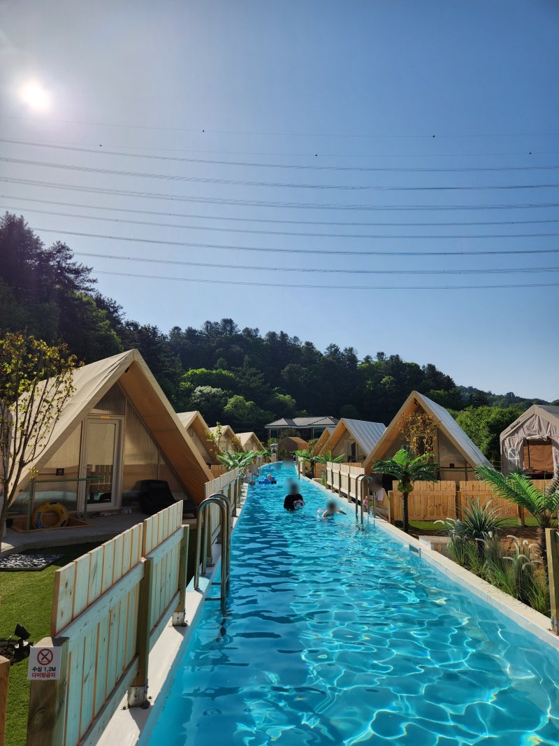 글램 탐다오의 가장 큰 특징 중 하나는 70미터 길이의 전객실 풀엑세스 온수풀 '라군’입니다. 이 풀장은 국내 글램핑장 중 최장 길이를 자랑하며, 모든 객실에서 직접 접근이 가능합니다. 미온수로 온도를 유지하는 시스템과 정화순환시스템을 갖추고 있어 계절과 시간에 관계없이 항상 쾌적하고 깨끗한 환경에서 수영을 즐길 수 있습니다. 특히 밤에는 은은한 조명과 함께 로맨틱한 분위기를 연출하여 특별한 경험을 제공합니다.