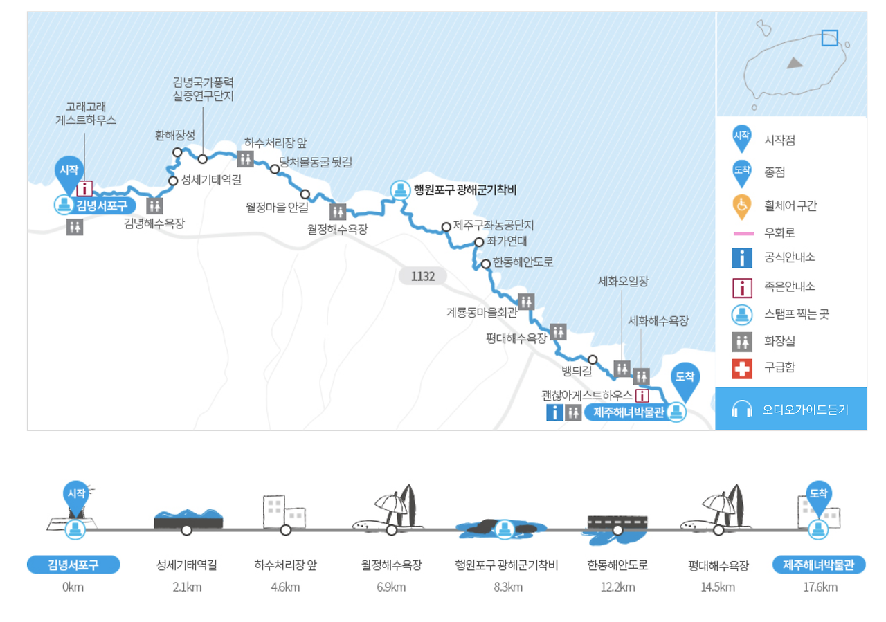 - 해안가를 따라 걸으며 다양한 색상의 제주 바다를 감상할 수 있습니다.