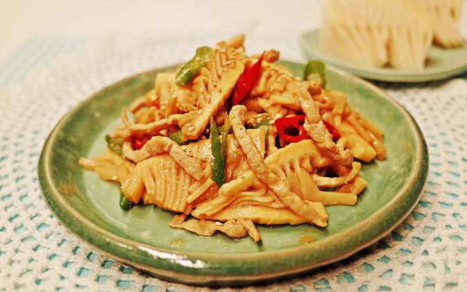• 재료: 손질한 죽순 150g, 돼지고기(목살 또는 앞다리살) 100g, 양파 1/2개, 파프리카(빨강, 노랑) 각 1/4개, 피망 1/4개, 다진 마늘 1큰술, 굴소스 1큰술, 간장 1/2큰술, 맛술 1큰술, 참기름 1/2큰술, 후춧가루 약간, 통깨 약간, 식용유