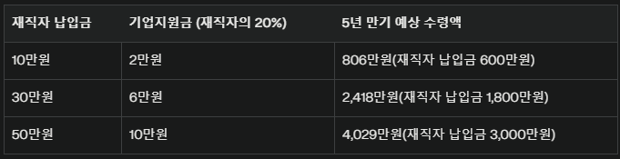 기업 지원금: 기업은 재직자 납부금의 20%를 추가로 지원합니다.