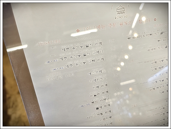 로드60의 메뉴도 정말 다양했어요. 다른 분들은 카페의 시그니처 메뉴인 '제주 유기농 말차 슈페너'를 많이 주문하시더라구요. 정말 맛있게 보이긴 하던데요. 저희 가족은 각자의 개성에 맞게, 카페라떼, 카페모카, 딸리 요거트 스무디를 주문했답니다.