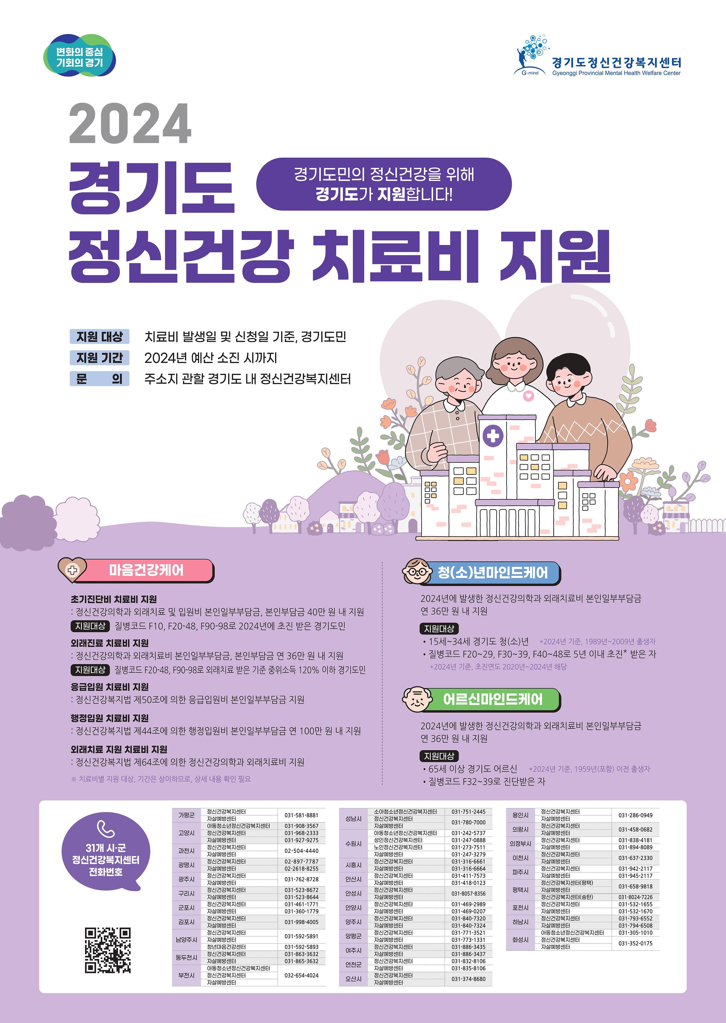 오늘은 이렇게 경기도민이라면 누구나 무료로 이용할 수 있는 정신건강복지센터의 다양한 서비스에 대해 알아보았는데요. 도움이 필요하신 분들은 언제든지 편하게 연락하셔서 상담 받아보시길 바랍니다.