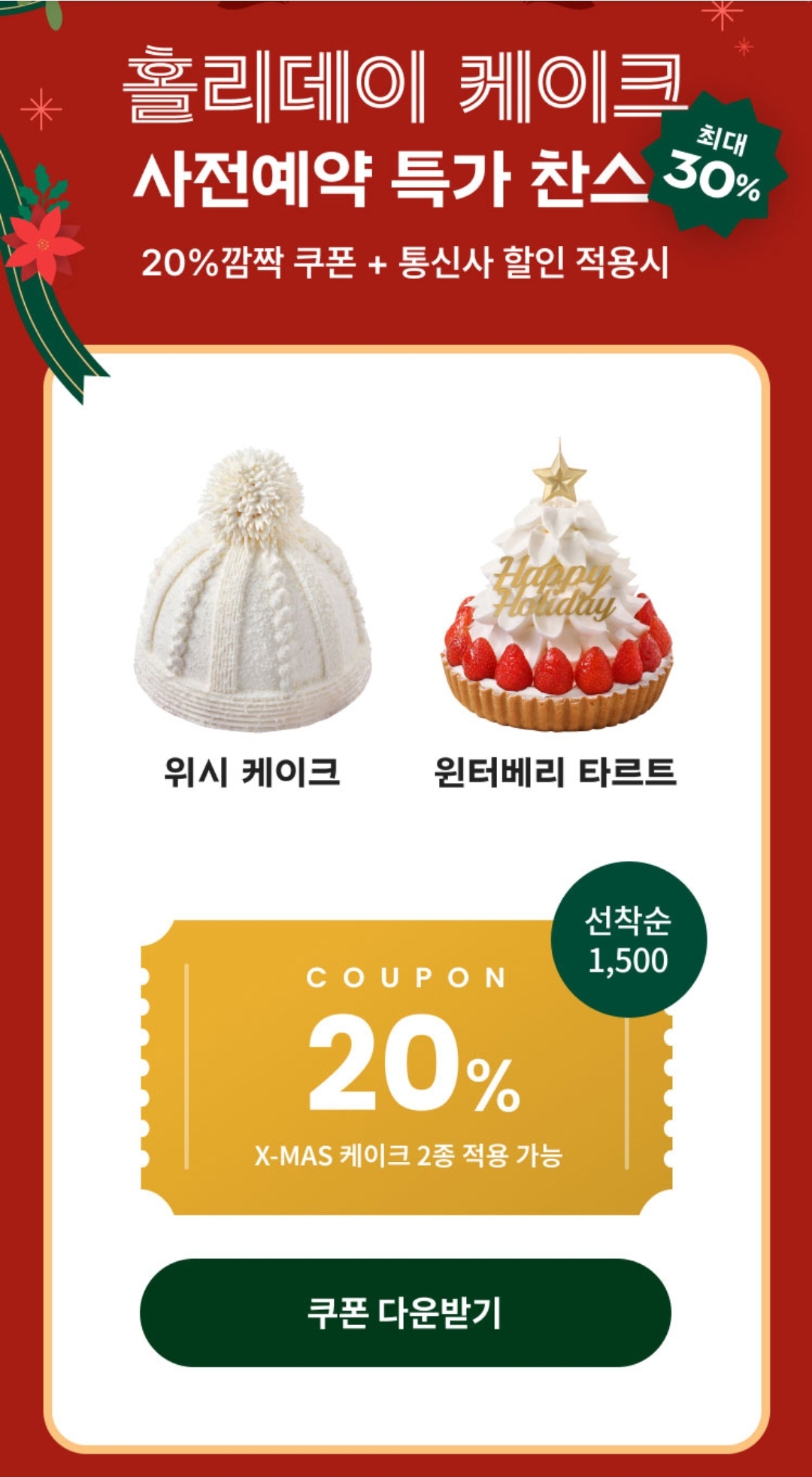 파리바게트 크리스마스 케이크 최대 30% 할인 혜택을 받기 위한 조건은 다음과 같습니다.