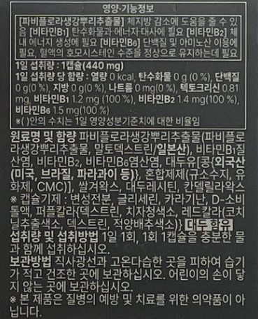 | 2. 핵심 성분 함량 | 파비플로라 추출물의 함량이 명확히 기재되어 있는지, 1일 권장 섭취량을 충족하는지 확인합니다. (예: 파비플로라 추출물로서 100mg 이상 등) | 1캡슐당 흑생강 10배 농축 추출물 500mg 함유. |