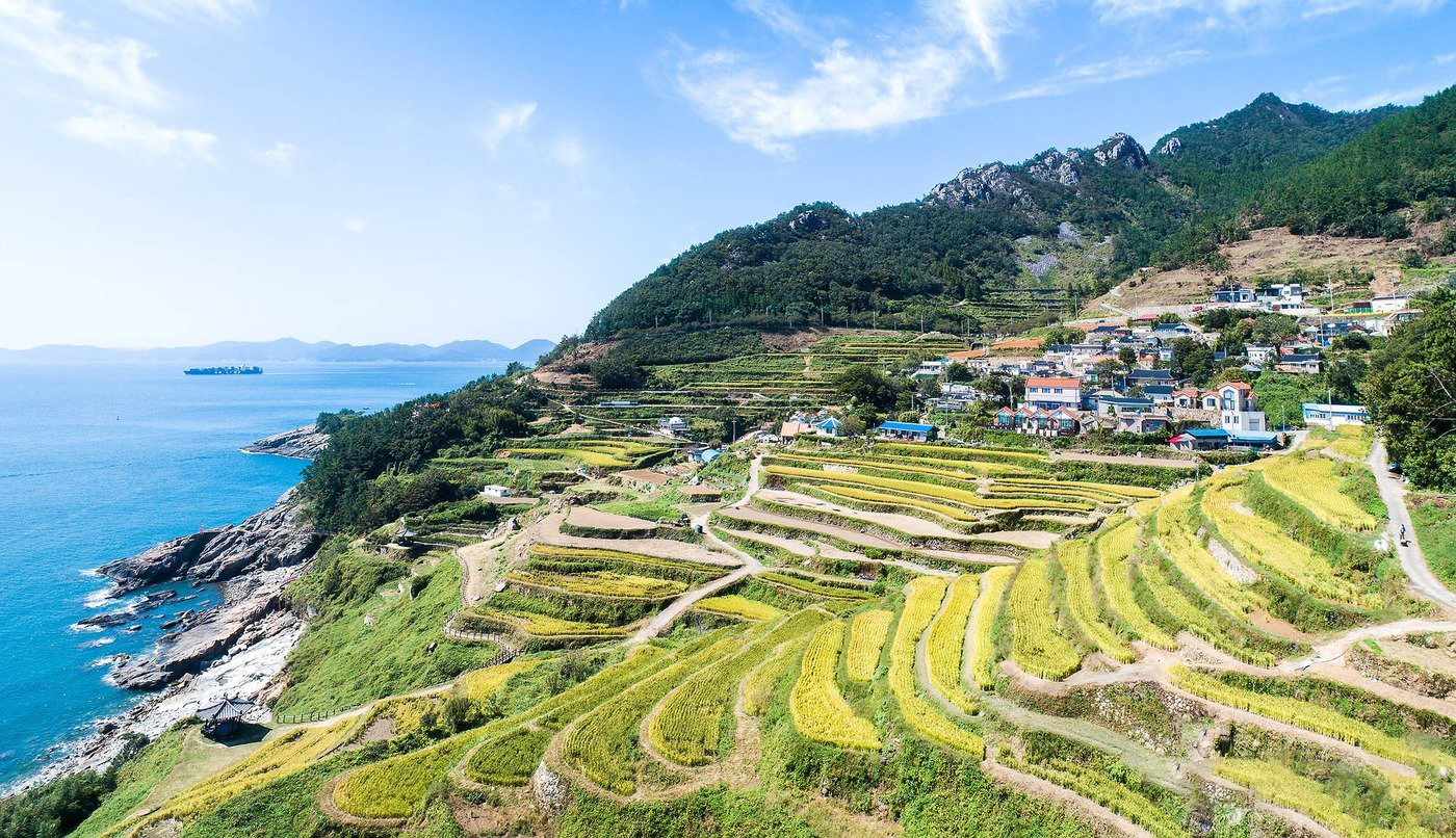 - 계단식 논과 쪽빛 바다가 어우러진 독특한 풍경