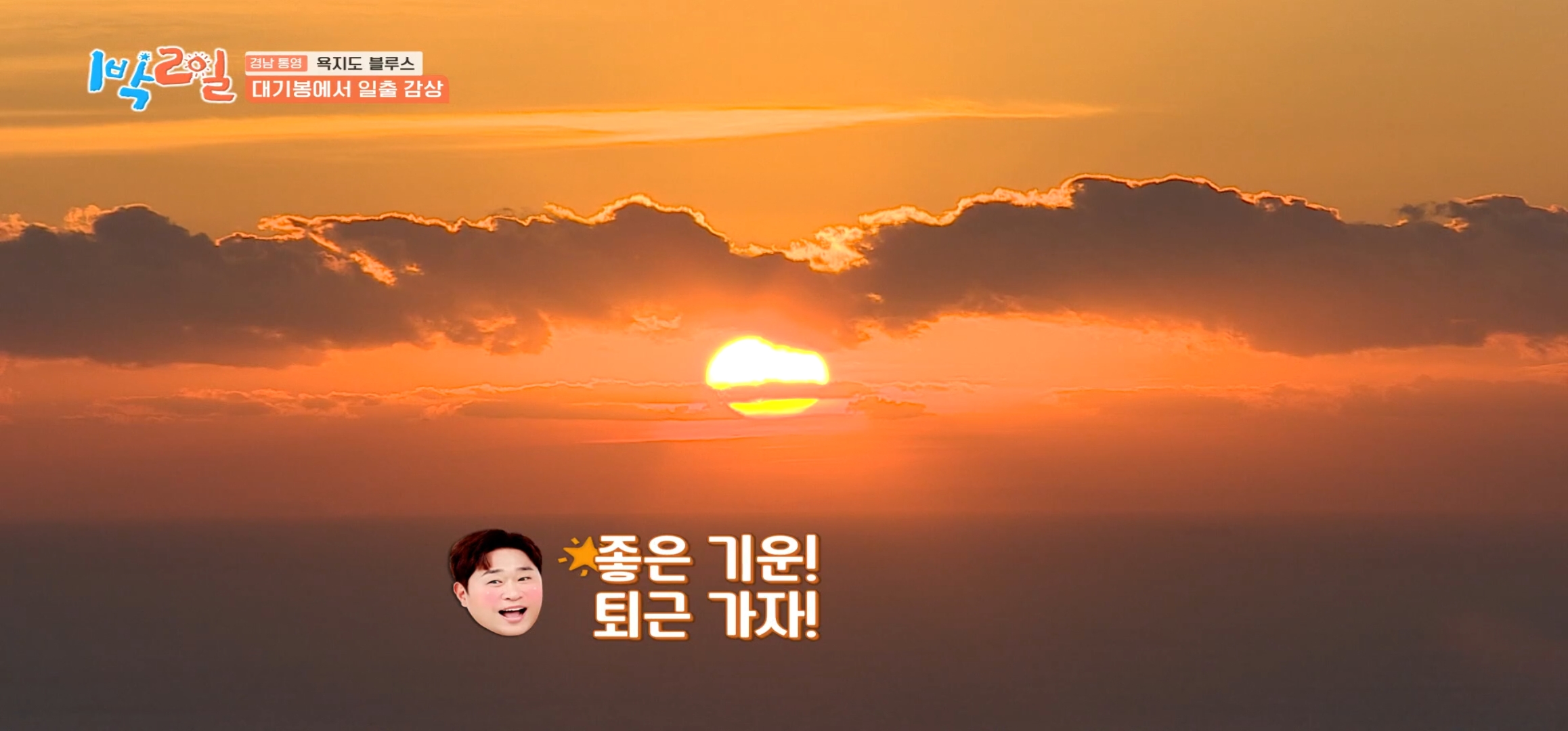 개인적으로는 정말 1박 2일에서 보여준 욕지도 대기봉에서의 일출이 이번 여행의 하이라이트였습니다. 아침 일찍 일어나 등산을 하며 투덜투덜되던 문세윤과 딘딘의 모습에서 대기봉의 일출을 크게 기대 안 했었는데요. 그렇게 맞이한 대기봉에서의 일출은 말로 표현할 수 없을 정도로 아름다웠고 감동적이었습니다. 티비로 보여지는 감동이 그러할지인데, 직접 본 문세윤과 딘딘은 어떠할까 부러울 따름입니다. 그들에게는 붉게 물든 하늘과 서서히 떠오르는 태양, 그리고 그 아래 펼쳐지는 섬의 모습은 평생 잊지 못할 추억이 될 것 같습니다.