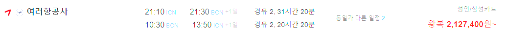다시 위에 과정을 해봅니다. 전주 금요일에 찾으니... 나오나요? 안 나오죠. 반 포기 상태에서 대한항공 홈페이지에 들어가봅니다. 똑같은 일정은 없었으나 월요일 인천 출발, 금요일 바르셀로나 출발이 나오네요.
