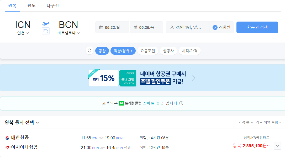 회사에서 해외출장 항공권 예약은 본인이 직접하는 스케줄입니다. 처음에 승인을 받은 출장스케줄은 3월 27일부터 3월 31일입니다. 예전에는 저렴한 항공권을 찾으려고 하나투어를 비롯해서 여기저기 찾았던 것 같은데, 요즘은 어떤 줄 몰라서 간단하게 네이버에서 항공권 검색을 해봅니다. 하나투어를 비롯한 여행사 홈페이지에서 항공권을 예약하던 형식으로 볼 수 있어서 굳이 여행사 홈페이지까지 들어가야하는 생각이 들었거든요.