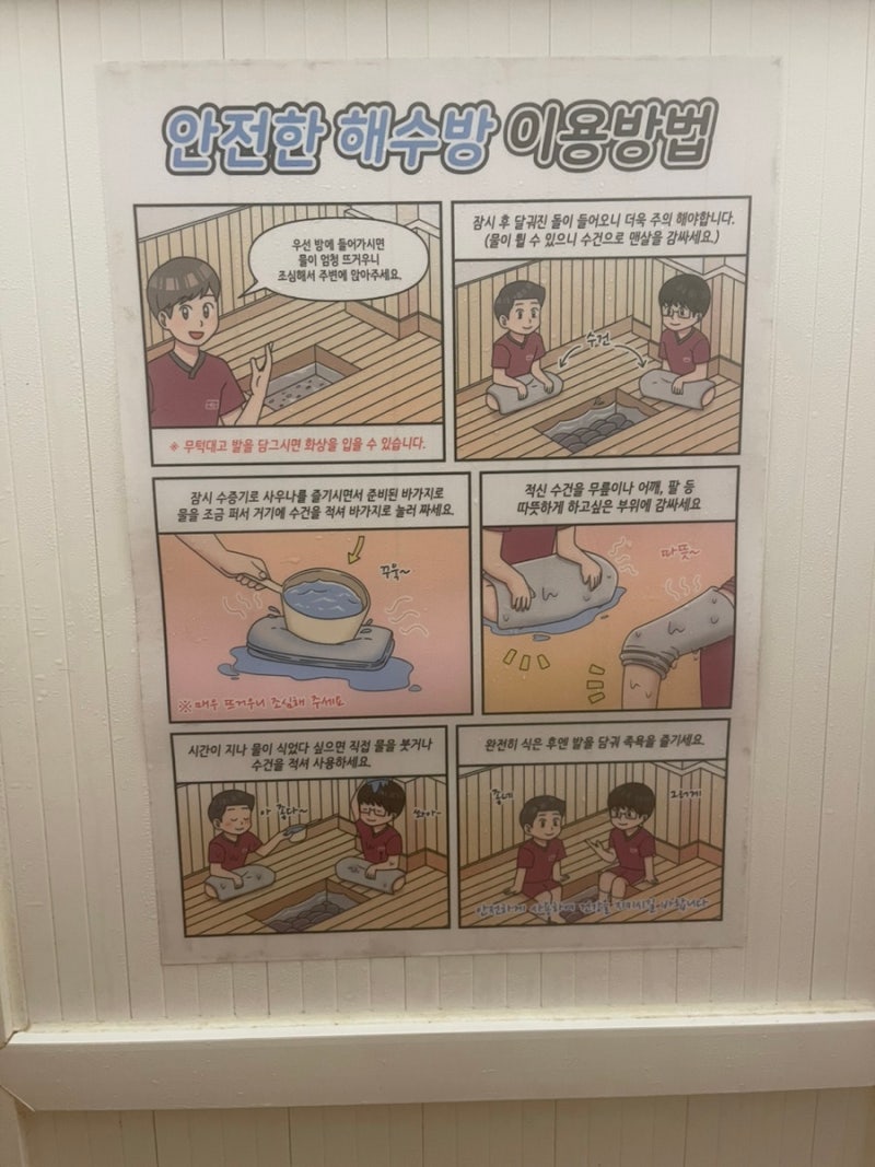 - 수건 사용법: 뜨거운 해수는 바가지를 이용해 수건에 적신 후, 바가지 바닥으로 물을 짜내어 사용합니다.